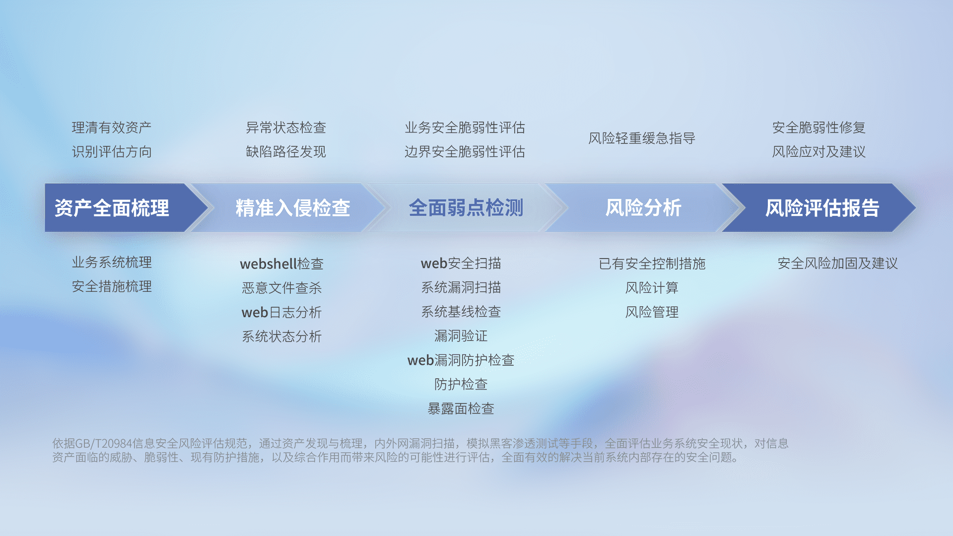 针对客户行业特性,,以专业的安全服务+多厂商联合解决方案提供专属的一站式安全管理服务,,,,帮助客户全面感知网络空间威胁,,基于识别、、、检测、、、分析、、、防护、、、监测、、、响应的服务理论模型,,,,从方案咨询、、、、集成交付、、评估验证、、优化加固、、、、运维运营,,,,致力于为客户提供完整的闭环管理式安全服务。。以实战经验为客户打造高抵御风险的安全体系,,帮助客户发现威胁、、、、对抗威胁、、处置威胁,,,不断积累安全对抗能力,,,持续保障数字化安全。。。